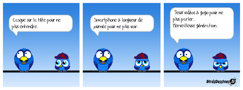 Case 1:Bird 1: Casque sur la tête pour ne plus entendre. | Case 2: Bird 1: Smartphone à longueur de journée pour ne plus voir. | Case 3: Bird 1: Jeux vidéos à gogo pour ne plus parler. Merveilleuse génération.
