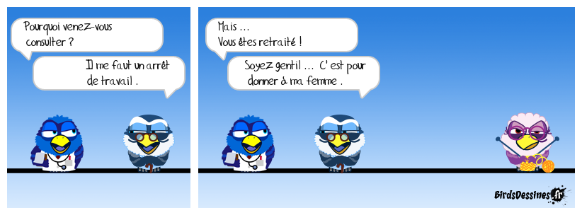 Case 1:Bird 1: Pourquoi venez-vous consulter ?Bird 2: Il me faut un arrêt de travail . | Case 2: Bird 1: Mais ... Vous êtes retraité ! Bird 2: Soyez gentil ... C' est pour donner à ma femme . | Case 3: