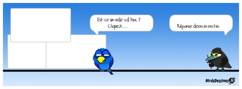 Case 1: | Case 2: Bird 1: Est-ce un vide ad-hoc ? Cliquez.... | Case 3: Bird 1: Réponse demain matin.