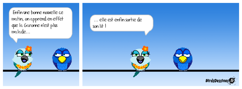 Case 1:Bird 1: Enfin une bonne nouvelle ce matin, on apprend en effet que la Garonne n'est plus malade... | Case 2: Bird 1: ... elle est enfin sortie de son lit ! | Case 3: