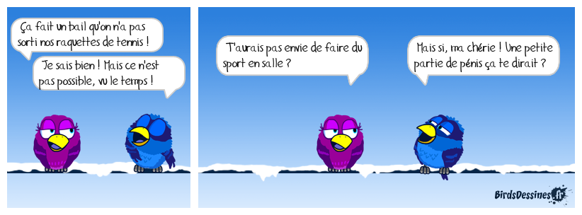 Case 1:Bird 1: Ça fait un bail qu'on n'a pas sorti nos raquettes de tennis !Bird 2: Je sais bien ! Mais ce n'est pas possible, vu le temps ! | Case 2: Bird 1: T'aurais pas envie de faire du sport en salle ? | Case 3: Bird 1: Mais si, ma chérie ! Une petite partie de pénis ça te dirait ?