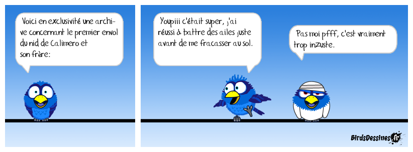Case 1:Bird 1: Voici en exclusivité une archi- ve concernant le premier envol du nid de Calimero et son frère: | Case 2: Bird 1: Youpiii c'était super, j'ai réussi à battre des ailes juste avant de me fracasser au sol. | Case 3: Bird 1: Pas moi pfff, c'est vraiment trop inzuste.