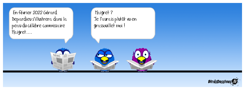 Case 1:Bird 1: En février 2022 Gérard Depardieu s'illustrera dans la peau du célèbre commissaire Maigret.... | Case 2: Bird 1: Maigret ? Je l'aurais plutôt vu en grassouillet moi ! | Case 3: