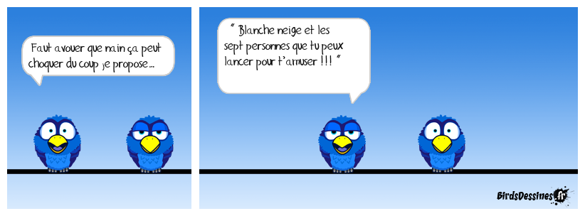 Case 1:Bird 1: Faut avouer que nain ça peut choquer du coup je propose… | Case 2: Bird 1: « Blanche neige et les sept personnes que tu peux lancer pour t’amuser !!! « | Case 3: