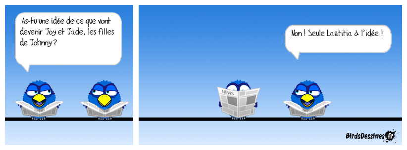 Case 1:Bird 1: As-tu une idée de ce que vont devenir Joy et Jade, les filles de Johnny ? | Case 2: | Case 3: Bird 1: Non ! Seule Laëtitia à l’idée !