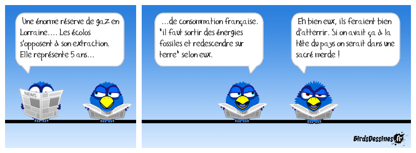 Case 1:Bird 1: Une énorme réserve de gaz en Lorraine.... Les écolos s'opposent à son extraction. Elle représente 5 ans... | Case 2: Bird 1: ...de consommation française. "il faut sortir des énergies fossiles et redescendre sur terre" selon eux. | Case 3: Bird 1: Eh bien eux, ils feraient bien d'atterrir. Si on avait ça à la tête du pays on serait dans une sacré merde !