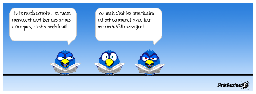 Case 1:Bird 1: tu te rends compte, les russes menacent d'utiliser des armes chimiques, c'est scandaleux! | Case 2: Bird 1: oui mais c'est les américains qui ont commencé avec leur vaccin à ARN messager! | Case 3: