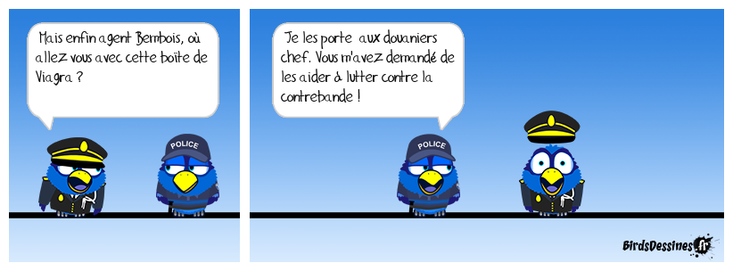 Case 1:Bird 1: Mais enfin agent Bembois, où allez vous avec cette boîte de Viagra ? | Case 2: Bird 1: Je les porte aux douaniers chef. Vous m'avez demandé de les aider à lutter contre la contrebande ! | Case 3: