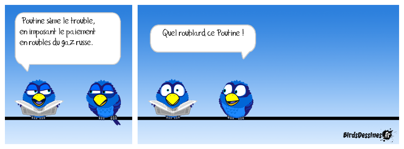 Case 1:Bird 1: Poutine sème le trouble, en imposant le paiement en roubles du gaz russe. | Case 2: Bird 1: Quel roublard ce Poutine ! | Case 3: