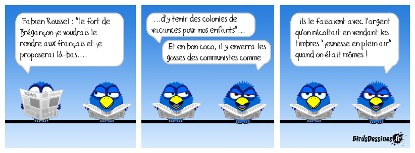 Case 1:Bird 1: Fabien Roussel : "le fort de Brégançon je voudrais le rendre aux français et je proposerai là-bas.... | Case 2: Bird 1: ...d'y tenir des colonies de vacances pour nos enfants"... Bird 2: Et en bon coco, il y enverra les gosses des communistes comme | Case 3: Bird 1: ils le faisaient avec l'argent qu'on récoltait en vendant les timbres "jeunesse en plein air" quand on était mômes !