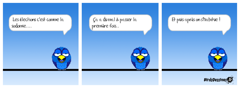 Case 1:Bird 1: Les élections c'est comme la sodomie.... | Case 2: Bird 1: Ça a du mal à passer la première fois.. | Case 3: Bird 1: Et puis après on s'habitue !
