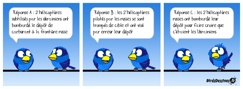 Case 1:Bird 1: Réponse A : 2 hélicoptères subtilisés par les ukrainiens ont bombardé le dépôt de carburant à la frontière russe | Case 2: Bird 1: Réponse B : les 2 hélicoptères pilotés par les russes se sont trompés de cible et ont visé par erreur leur dépôt | Case 3: Bird 1: Réponse C : les 2 hélicoptères russes ont bombardé leur dépôt pour faire croire que c'étaient les Ukrainiens