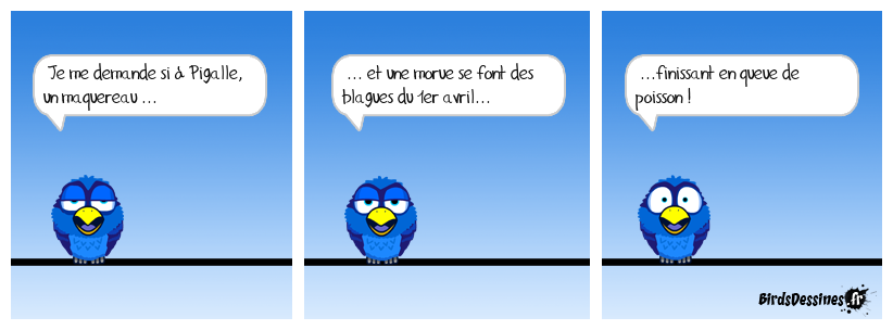 Case 1:Bird 1: Je me demande si à Pigalle, un maquereau ... | Case 2: Bird 1: ... et une morue se font des blagues du 1er avril... | Case 3: Bird 1: ...finissant en queue de poisson !