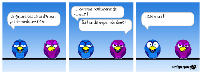 Case 1:Bird 1: Originaire des Côtes d'Armor, j'ai demandé une flûte ... | Case 2: Bird 1: ... dans une boulangerie de Karaez ! Bird 2: Ici ! on dit un pain de deux ! | Case 3: Bird 1: Flûte alors !