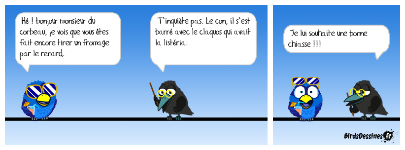 Case 1:Bird 1: Hé ! bonjour monsieur du corbeau, je vois que vous êtes fait encore tirer un fromage par le renard. | Case 2: Bird 1: T’inquiète pas. Le con, il s’est barré avec le claquos qui avait la listéria. | Case 3: Bird 1: Je lui souhaite une bonne chiasse !!!