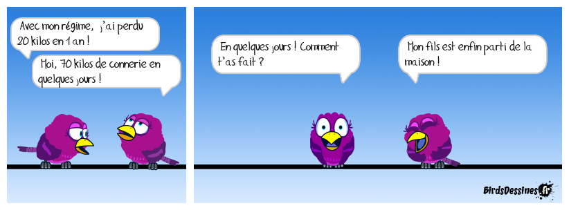 Case 1:Bird 1: Avec mon régime, j’ai perdu 20 kilos en 1 an !Bird 2: Moi, 70 kilos de connerie en quelques jours ! | Case 2: Bird 1: En quelques jours ! Comment t’as fait ? | Case 3: Bird 1: Mon fils est enfin parti de la maison !