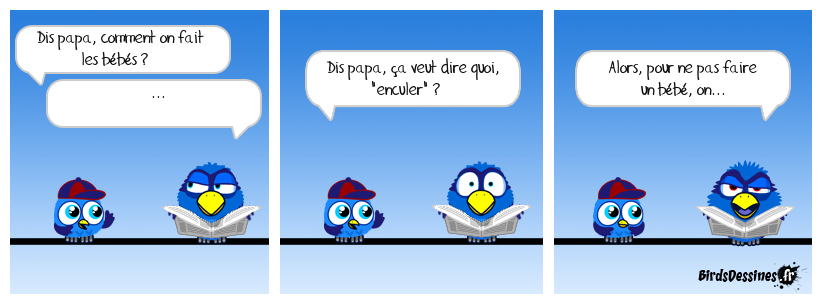 Case 1:Bird 1: Dis papa, comment on fait les bébés ?Bird 2: ... | Case 2: Bird 1: Dis papa, ça veut dire quoi, "enculer" ? | Case 3: Bird 1: Alors, pour ne pas faire un bébé, on...