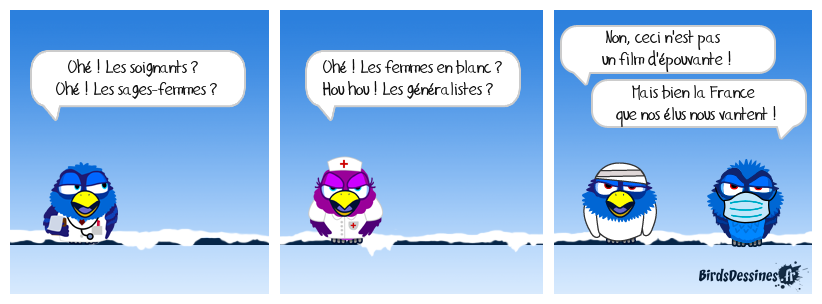 Case 1:Bird 1: Ohé ! Les soignants ? Ohé ! Les sages-femmes ? | Case 2: Bird 1: Ohé ! Les femmes en blanc ? Hou hou ! Les généralistes ? | Case 3: Bird 1: Non, ceci n'est pas un film d'épouvante ! Bird 2: Mais bien la France que nos élus nous vantent !