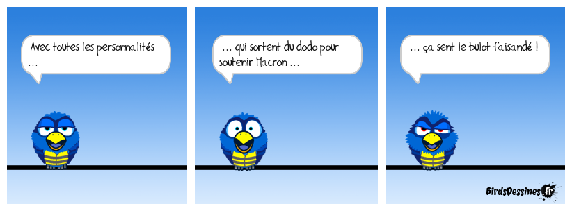 Case 1:Bird 1: Avec toutes les personnalités ... | Case 2: Bird 1: ... qui sortent du dodo pour soutenir Macron ... | Case 3: Bird 1: ... ça sent le bulot faisandé !
