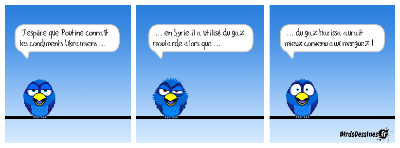 Case 1:Bird 1: J'espère que Poutine connaït les condiments Ukrainiens ... | Case 2: Bird 1: ... en Syrie il a utilisé du gaz moutarde alors que ... | Case 3: Bird 1: ... du gaz harissa aurait mieux convenu aux merguez !