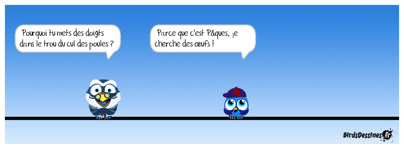 Case 1:Bird 1: Pourquoi tu mets des doigts dans le trou du cul des poules ? | Case 2: Bird 1: Parce que c'est Pâques, je cherche des œufs ! | Case 3: