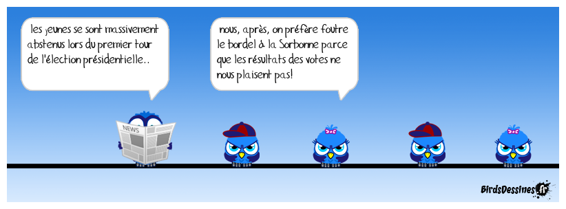 Case 1:Bird 1: les jeunes se sont massivement abstenus lors du premier tour de l'élection présidentielle.. | Case 2: Bird 1: nous, après, on préfère foutre le bordel à la Sorbonne parce que les résultats des votes ne nous plaisent pas! | Case 3: