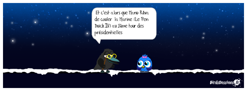Case 1: | Case 2: Bird 1: Et c'est alors que Manu-Rêva de couler la Marine (Le Pen Duick IV) au 2ème tour des présidentielles | Case 3: