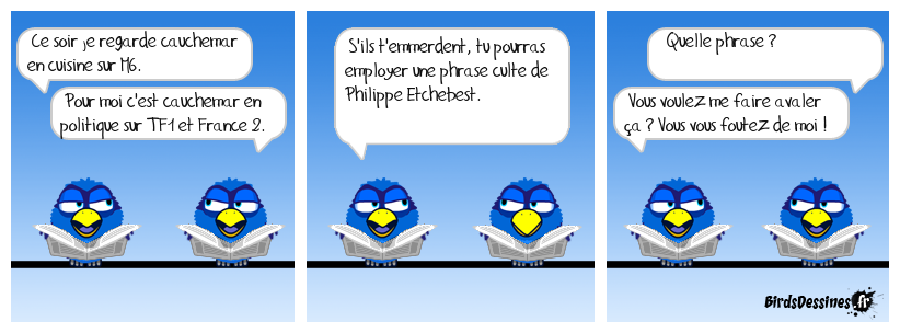 Case 1:Bird 1: Ce soir je regarde cauchemar en cuisine sur M6.Bird 2: Pour moi c'est cauchemar en politique sur TF1 et France 2. | Case 2: Bird 1: S'ils t'emmerdent, tu pourras employer une phrase culte de Philippe Etchebest. | Case 3: Bird 1: Quelle phrase ? Bird 2: Vous voulez me faire avaler ça ? Vous vous foutez de moi !
