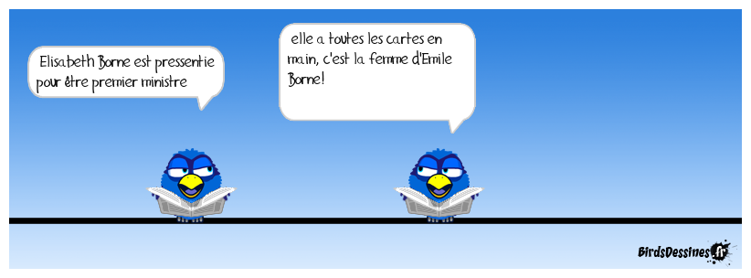 Case 1:Bird 1: Elisabeth Borne est pressentie pour être premier ministre | Case 2: Bird 1: elle a toutes les cartes en main, c'est la femme d'Emile Borne! | Case 3: