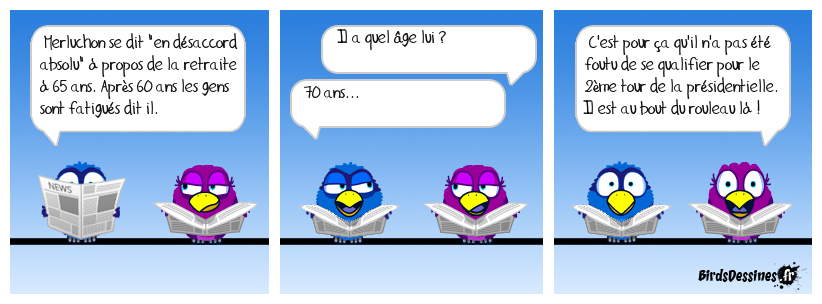 Case 1:Bird 1: Merluchon se dit "en désaccord absolu" à propos de la retraite à 65 ans. Après 60 ans les gens sont fatigués dit il. | Case 2: Bird 1: Il a quel âge lui ? Bird 2: 70 ans... | Case 3: Bird 1: C'est pour ça qu'il n'a pas été foutu de se qualifier pour le 2ème tour de la présidentielle. Il est au bout du rouleau là !