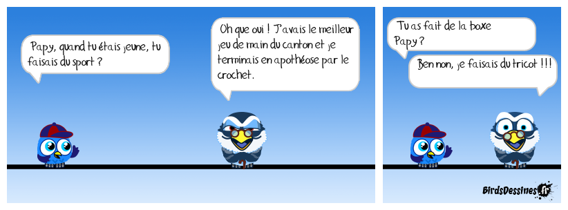 Case 1:Bird 1: Papy, quand tu étais jeune, tu faisais du sport ? | Case 2: Bird 1: Oh que oui ! J’avais le meilleur jeu de main du canton et je terminais en apothéose par le crochet. | Case 3: Bird 1: Tu as fait de la boxe Papy ? Bird 2: Ben non, je faisais du tricot !!!