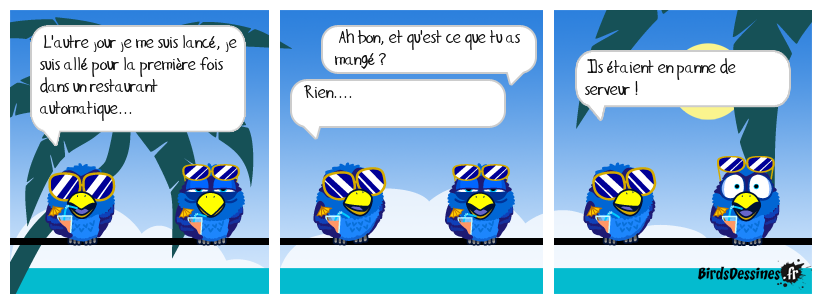 Case 1:Bird 1: L'autre jour je me suis lancé, je suis allé pour la première fois dans un restaurant automatique... | Case 2: Bird 1: Ah bon, et qu'est ce que tu as mangé ? Bird 2: Rien.... | Case 3: Bird 1: Ils étaient en panne de serveur !