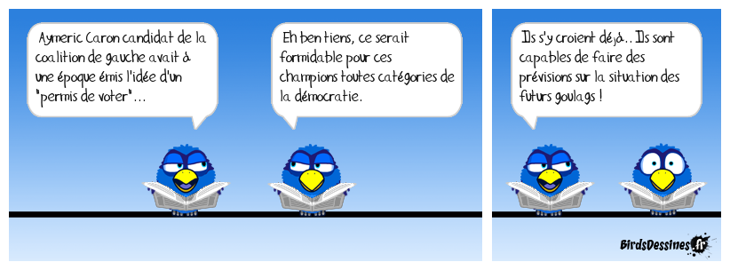 Case 1:Bird 1: Aymeric Caron candidat de la coalition de gauche avait à une époque émis l'idée d'un "permis de voter"... | Case 2: Bird 1: Eh ben tiens, ce serait formidable pour ces champions toutes catégories de la démocratie. | Case 3: Bird 1: Ils s'y croient déjà.. Ils sont capables de faire des prévisions sur la situation des futurs goulags !