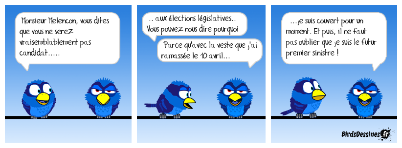 Case 1:Bird 1: Monsieur Melencon, vous dites que vous ne serez vraisemblablement pas candidat..... | Case 2: Bird 1: .. aux élections législatives.. Vous pouvez nous dire pourquoi Bird 2: Parce qu'avec la veste que j'ai ramassée le 10 avril... | Case 3: Bird 1: ...je suis couvert pour un moment. Et puis, il ne faut pas oublier que je suis le futur premier sinistre !