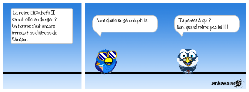 Case 1:Bird 1: La reine Elizabeth II serait-elle en danger ? Un homme s’est encore introduit au château de Windsor. | Case 2: Bird 1: Sans doute un gérontophile. | Case 3: Bird 1: Tu penses à qui ? Non, quand même pas lui !!!
