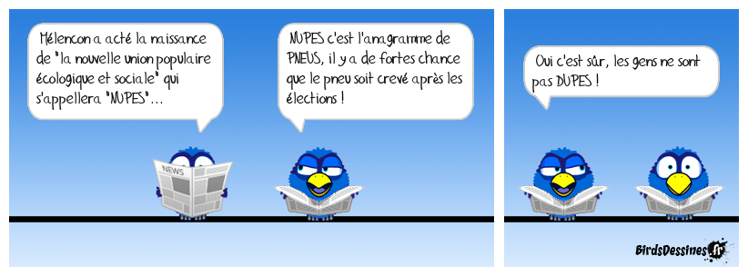 Case 1:Bird 1: Mélencon a acté la naissance de "la nouvelle union populaire écologique et sociale" qui s'appellera "NUPES"... | Case 2: Bird 1: NUPES c'est l'anagramme de PNEUS, il y a de fortes chance que le pneu soit crevé après les élections ! | Case 3: Bird 1: Oui c'est sûr, les gens ne sont pas DUPES !