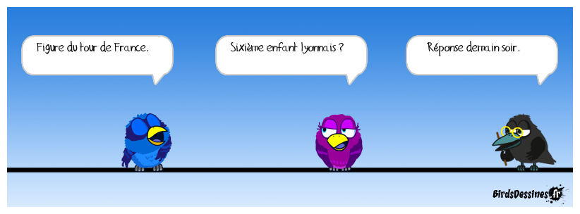 Case 1:Bird 1: Figure du tour de France. | Case 2: Bird 1: Sixième enfant lyonnais ? | Case 3: Bird 1: Réponse demain soir.