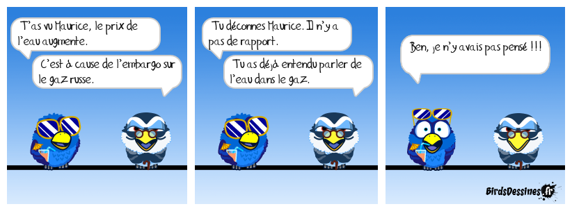 Case 1:Bird 1: T’as vu Maurice, le prix de l’eau augmente.Bird 2: C’est à cause de l’embargo sur le gaz russe. | Case 2: Bird 1: Tu déconnes Maurice. Il n’y a pas de rapport. Bird 2: Tu as déjà entendu parler de l’eau dans le gaz. | Case 3: Bird 1: Ben, je n’y avais pas pensé !!!