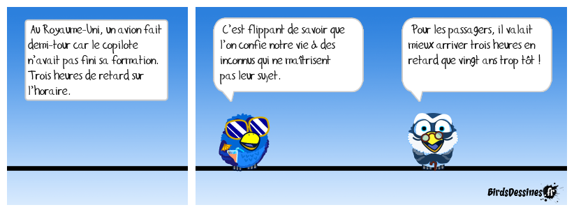 Case 1:Bird 1: Au Royaume-Uni, un avion fait demi-tour car le copilote n’avait pas fini sa formation. Trois heures de retard sur l’horaire. | Case 2: Bird 1: C’est flippant de savoir que l’on confie notre vie à des inconnus qui ne maïtrisent pas leur sujet. | Case 3: Bird 1: Pour les passagers, il valait mieux arriver trois heures en retard que vingt ans trop tôt !