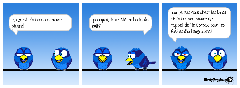 Case 1:Bird 1: ça y est, j'ai encore eu une piqure! | Case 2: Bird 1: pourquoi, tu as été en boite de nuit? | Case 3: Bird 1: non je suis venu chez les birds et j'ai eu une piqure de rappel de Me Corbac pour les fautes d'orthographe!