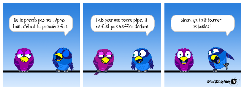Case 1:Bird 1: Ne le prends pas mal. Après tout, c'était ta première fois. | Case 2: Bird 1: Mais pour une bonne pipe, il ne faut pas souffler dedans. | Case 3: Bird 1: Sinon, ça fait tourner les boules !
