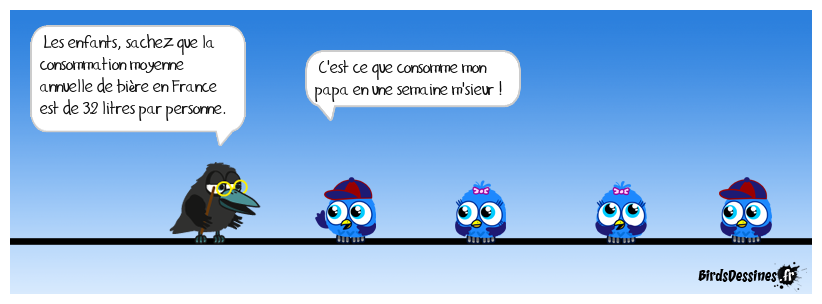 Case 1:Bird 1: Les enfants, sachez que la consommation moyenne annuelle de bière en France est de 32 litres par personne. | Case 2: Bird 1: C'est ce que consomme mon papa en une semaine m'sieur ! | Case 3: