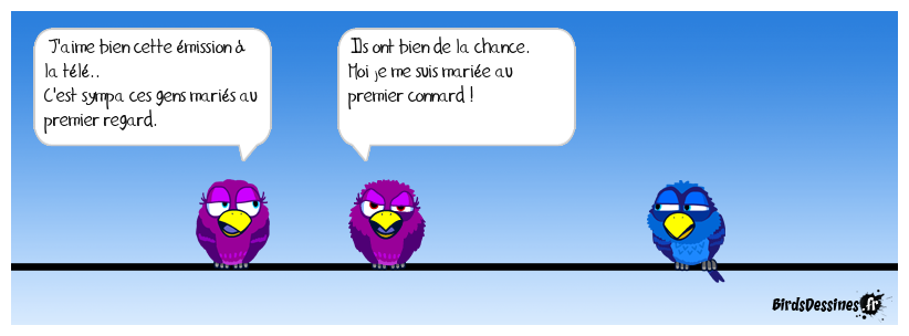 Case 1:Bird 1: J'aime bien cette émission à la télé.. C'est sympa ces gens mariés au premier regard. | Case 2: Bird 1: Ils ont bien de la chance. Moi je me suis mariée au premier connard ! | Case 3: