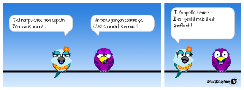 Case 1:Bird 1: J'ai rompu avec mon copain. J'en avais marre.. | Case 2: Bird 1: Un beau garçon comme ça. C'est comment son nom ? | Case 3: Bird 1: Il s'appelle Levure. Il est gentil mais il est gonflant !