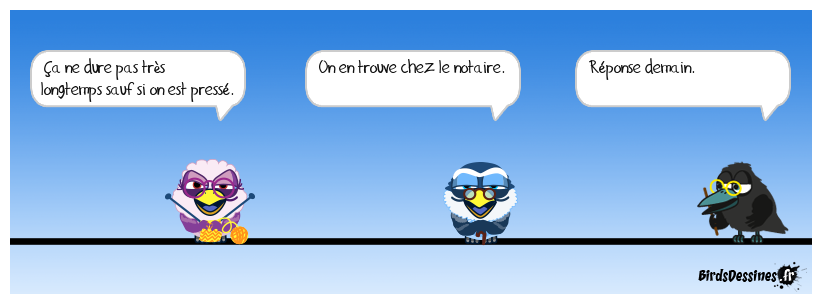 Case 1:Bird 1: Ça ne dure pas très longtemps sauf si on est pressé. | Case 2: Bird 1: On en trouve chez le notaire. | Case 3: Bird 1: Réponse demain.
