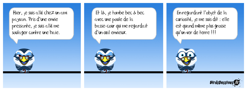 Case 1:Bird 1: Hier, je suis allé chez un ami paysan. Pris d’une envie pressante, je suis allé me soulager contre une haie. | Case 2: Bird 1: Et là, je tombe bec à bec avec une poule de la basse-cour qui me regardait d’un œil envieux. | Case 3: Bird 1: En regardant l’objet de la curiosité, je me suis dit : elle est quand même plus grosse qu’un ver de terre !!!