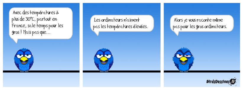 Case 1:Bird 1: Avec des températures à plus de 30°C, partout en France, sale temps pour les gros ! Mais pas que... | Case 2: Bird 1: Les ordinateurs n'aiment pas les températures élevées. | Case 3: Bird 1: Alors je vous raconte même pas pour les gros ordinateurs.