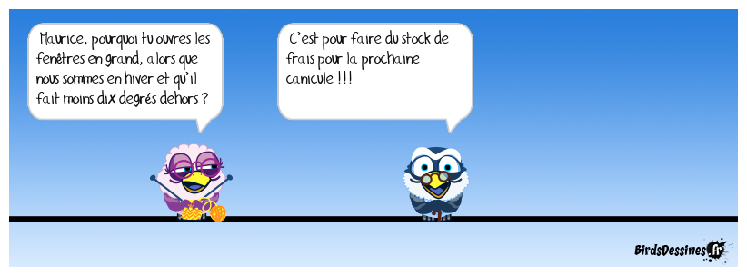 Case 1:Bird 1: Maurice, pourquoi tu ouvres les fenêtres en grand, alors que nous sommes en hiver et qu’il fait moins dix degrés dehors ? | Case 2: Bird 1: C’est pour faire du stock de frais pour la prochaine canicule !!! | Case 3: