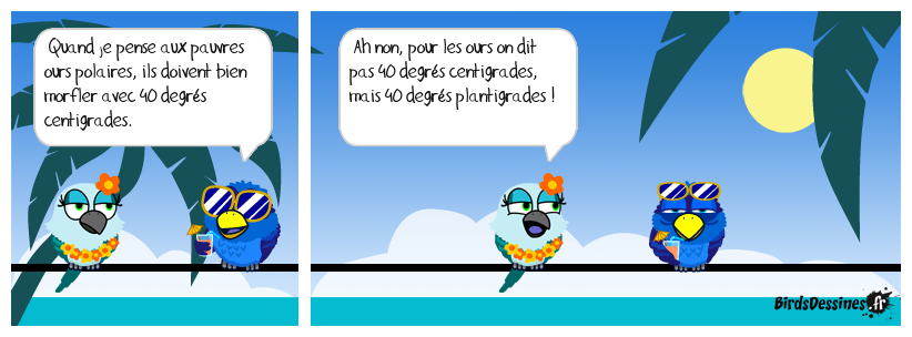 Case 1:Bird 1: Quand je pense aux pauvres ours polaires, ils doivent bien morfler avec 40 degrés centigrades. | Case 2: Bird 1: Ah non, pour les ours on dit pas 40 degrés centigrades, mais 40 degrés plantigrades ! | Case 3: