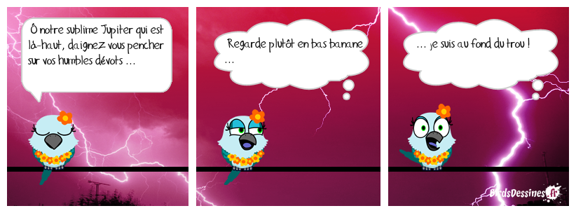 Case 1:Bird 1: Ô notre sublime Jupiter qui est là-haut, daignez vous pencher sur vos humbles dévots ... | Case 2: Bird 1: Regarde plutôt en bas banane ... | Case 3: Bird 1: ... je suis au fond du trou !